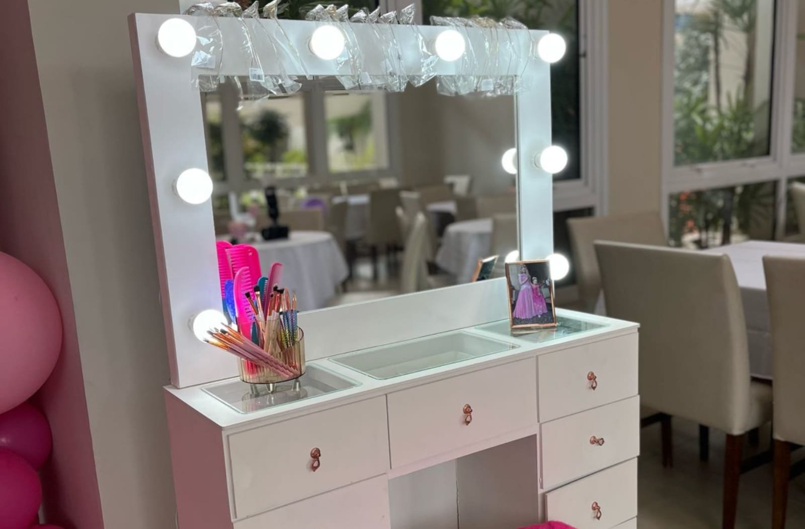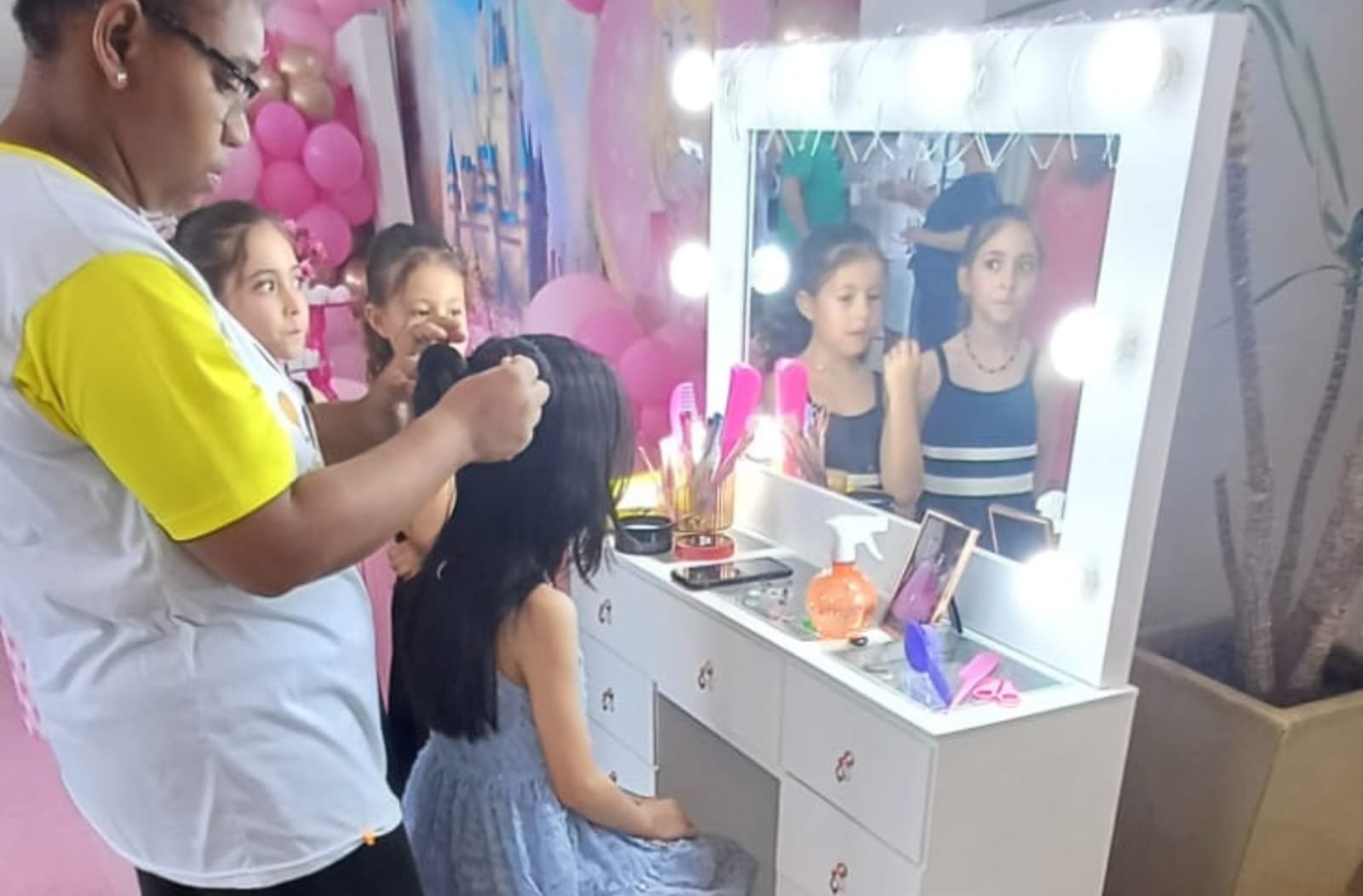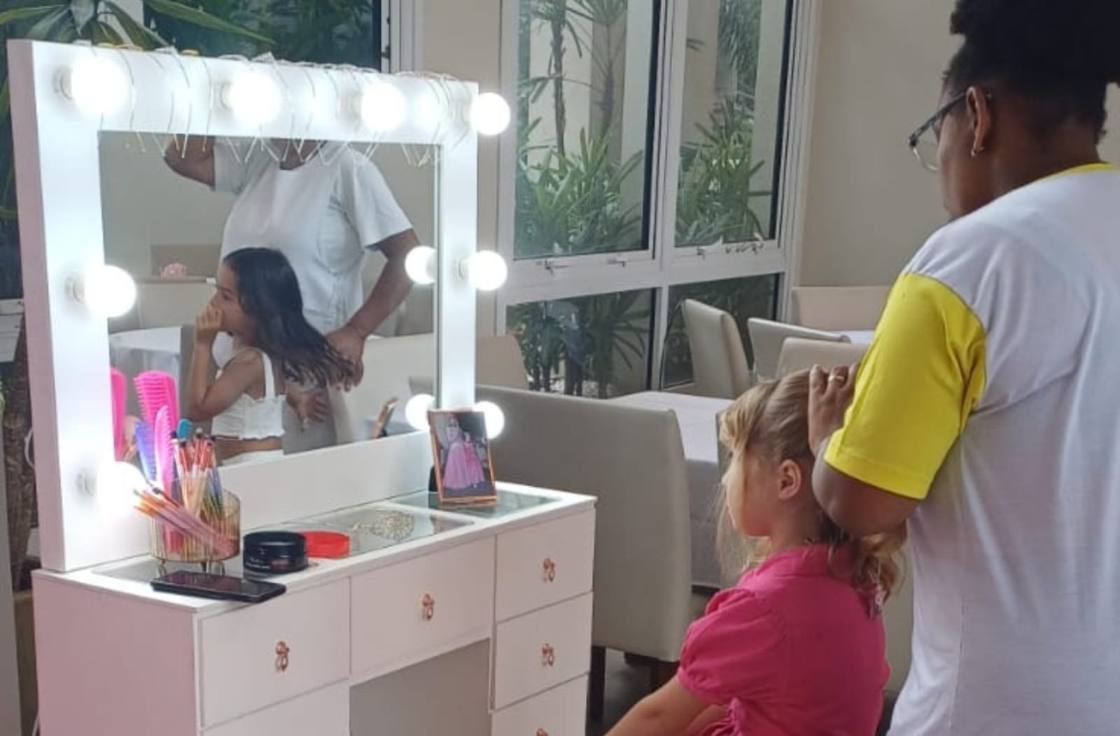 Camarim Completo com Luzes e Profissional da área da Estética e Beleza para montar penteados simples e discretos ou mais coloridos, Tererê, Coques, arrojados, fashion e divertido. Com maquiagem e unhas para as meninas. Já os meninos a diversão acontece com moldes de desenhos, penteados com gel e spray colorido.