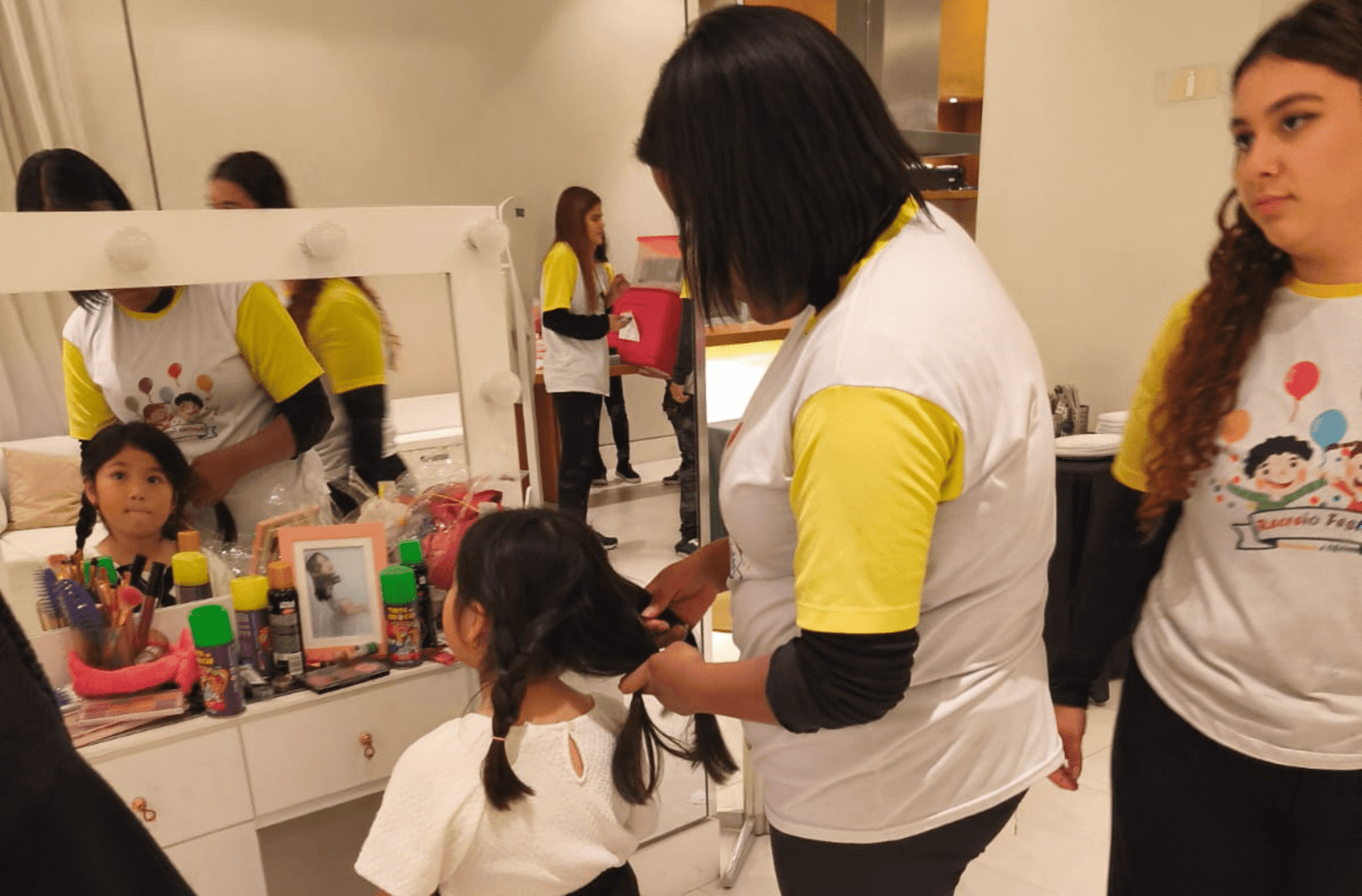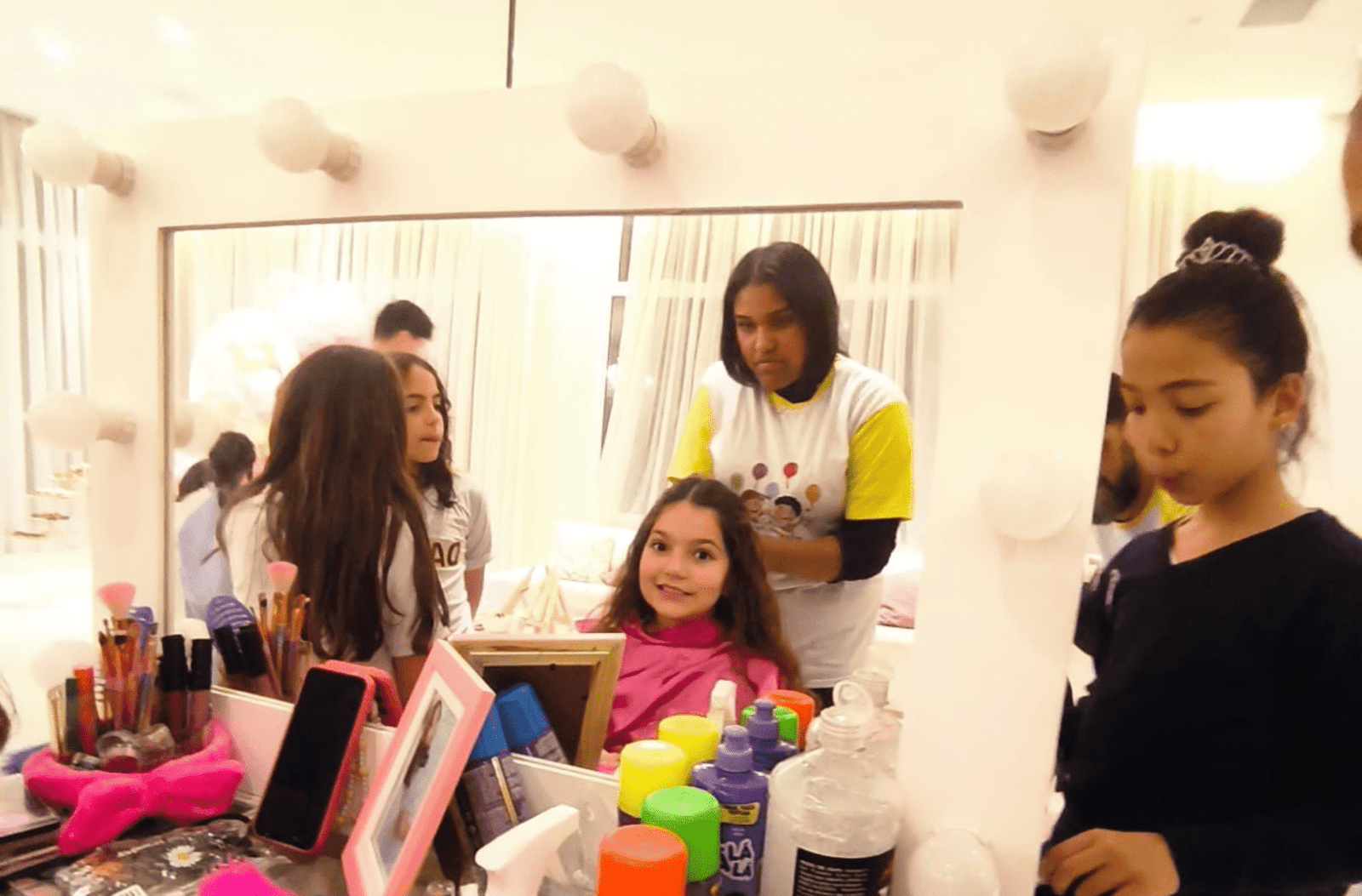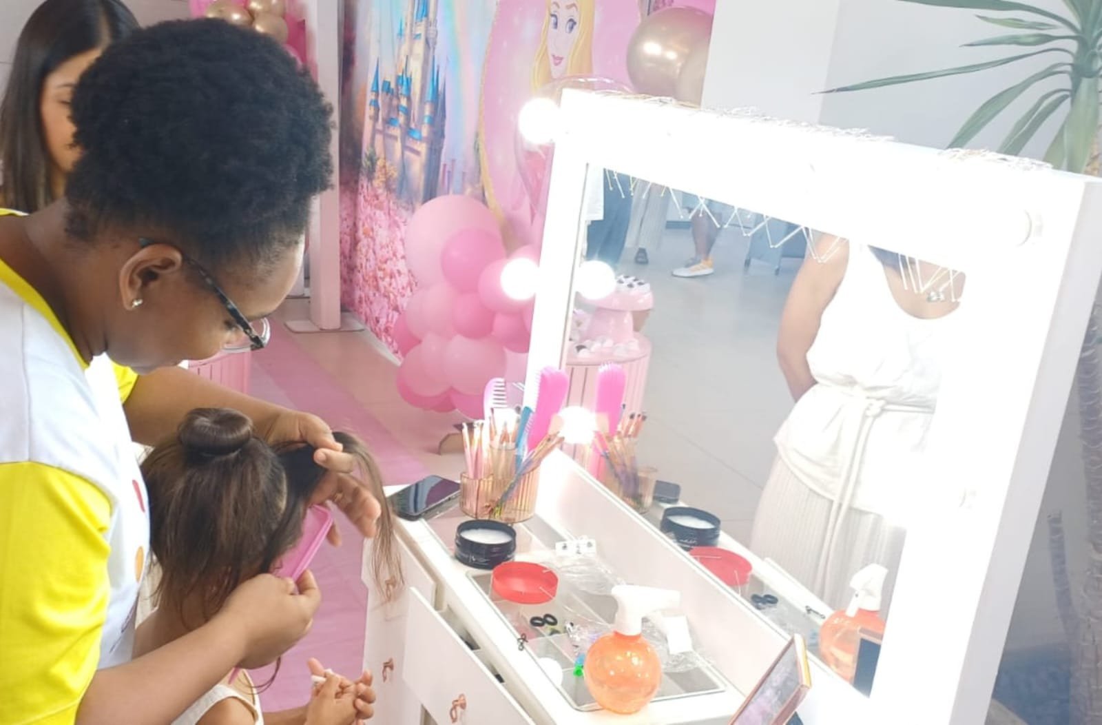 Camarim Completo com Luzes e Profissional da área da Estética e Beleza para montar penteados simples e discretos ou mais coloridos, Tererê, Coques, arrojados, fashion e divertido. Com maquiagem e unhas para as meninas. Já os meninos a diversão acontece com moldes de desenhos, penteados com gel e spray colorido.